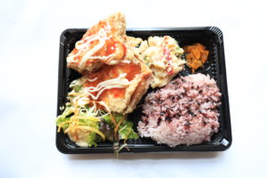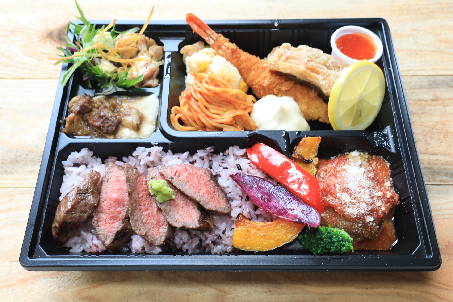 唐揚げ弁当、洋食弁当、大きなエビフライが入った弁当、淡路牛ステーキ弁当など。